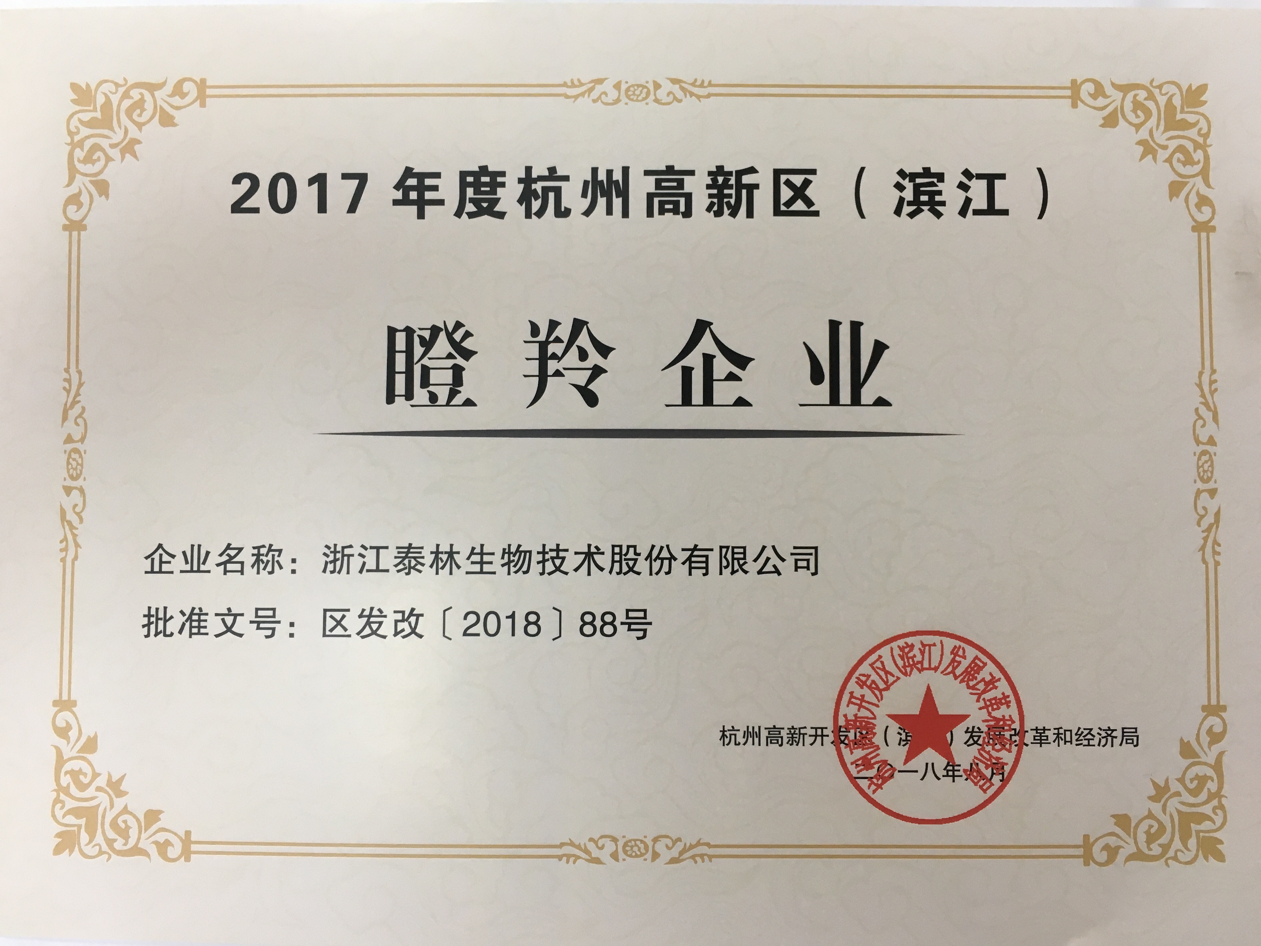 2018年8月下旬,2017年度高新区(滨江)瞪羚企业名单公布,浙江金沙9001以诚为本技术股份有限公司榜上有名,标志着金沙9001以诚为本连续3年获评高新区(滨江)瞪羚企业称号。